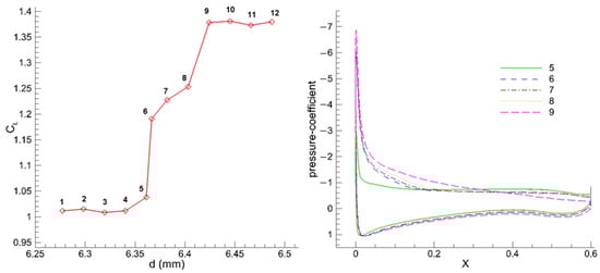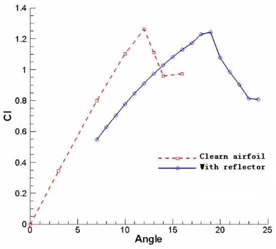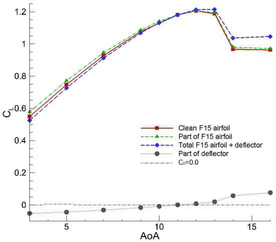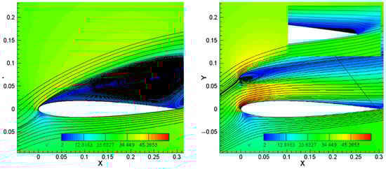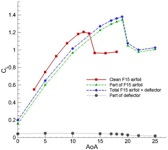Figure 7 illustrates the lift coefficient curve for the airfoil with the optimal flow deflector for post-stall conditions. Compared to the baseline airfoil, the stall’s AoA diverges by approximately , with the results exceeding those reported in open studies in the literature.