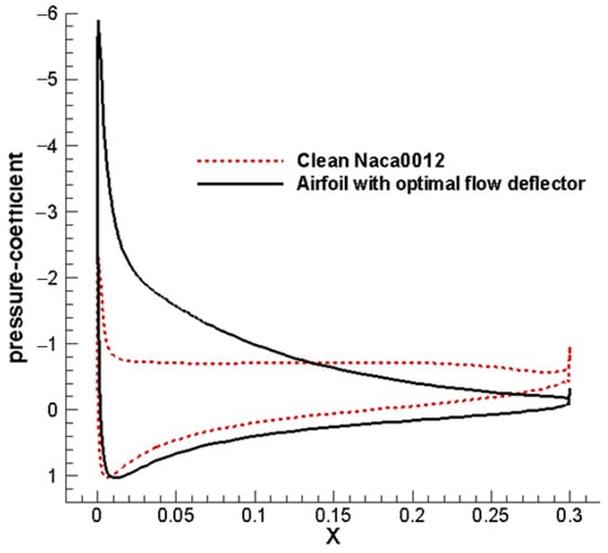 Figure 5 and Figure 6 demonstrate that the optimized flow deflector enhances the suction peak near the airfoil’s leading edge. Figure 5 reveals a dominant vortex structure on the clean airfoil’s upper surface. In contrast, the optimized deflector configuration maintains its attached flow over the upper surface, effectively suppressing vortex formation while retaining only a minimal trailing-edge vortex, indicating controlled separation. The deflector redirects separated flow toward the upper surface, imparting centripetal acceleration to promote flow attachment. Additionally, it introduces high-momentum fluid into the boundary layer, augmenting kinetic energy to counteract adverse pressure gradients.