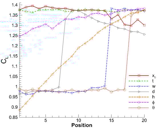 Employing a one-factor-at-a-time methodology, each parameter was systematically varied while maintaining others at their optimal values. Table 4 details the test point distribution for each parameter, with 20 discrete positions evaluated per variable. Figure 8 presents the corresponding variations for the lift coefficient across the parameter ranges.