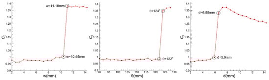 The parameter demonstrated negligible sensitivity to parameter , justifying its exclusion from subsequent optimization phases. Notably, three parameters , and exhibited fundamentally different behavior: they maintained minimal impact on until reaching critical thresholds, beyond which abrupt performance transitions occurred. To elucidate these discontinuous transitions, flow features near the flow deflector, w, were examined for parameter values bracketing these critical points, as depicted in Figure 9.