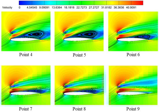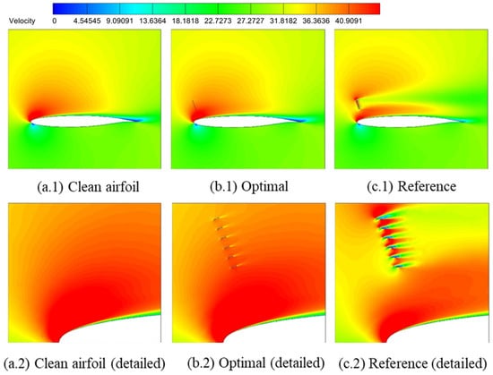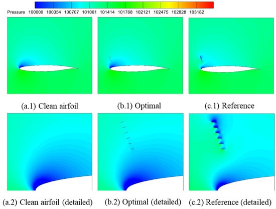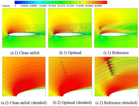 The aerodynamic performances of a clean airfoil, airfoil with an optimal deflector, and airfoil with a reference deflector are calculated and compared in Table 11. All the aerodynamic coefficients listed in Table 11 were computed without considering the contribution of the flow deflector itself. Compared with the original clean airfoil, the lift coefficient of the airfoil with optimized flow deflector increased by 0.40%; the drag coefficient decreased by 1.53%; and the lift–drag ratio increased by 1.96%. The optimal flow deflector for pre-stall conditions was designed to achieve the goal of not reducing the performance of the clean airfoil. At the same time, the reference configuration’s lift coefficient decreased by 9.11%; the drag coefficient increased by 39.20%; and the lift–drag ratio decreased by 34.71%, with behaviors worse than the clean airfoil.