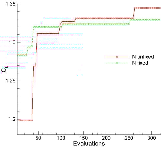 Table 7 presents the optimal parameter set for the 2D flow deflector alongside results from the fixed n = 6 case. Notably, the optimization yielded n = 8. The optimization of problem (2) was executed, with the convergence history depicted in Figure 12.
