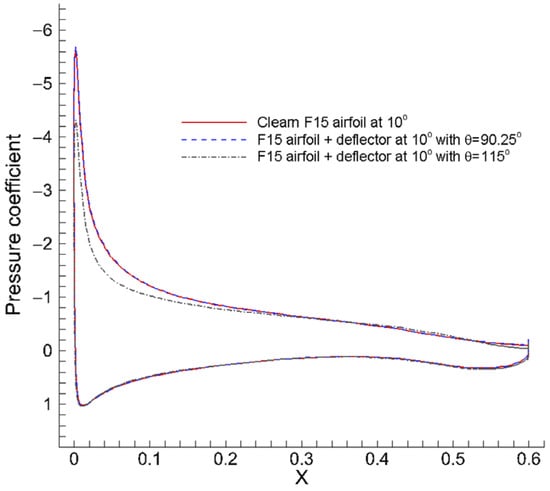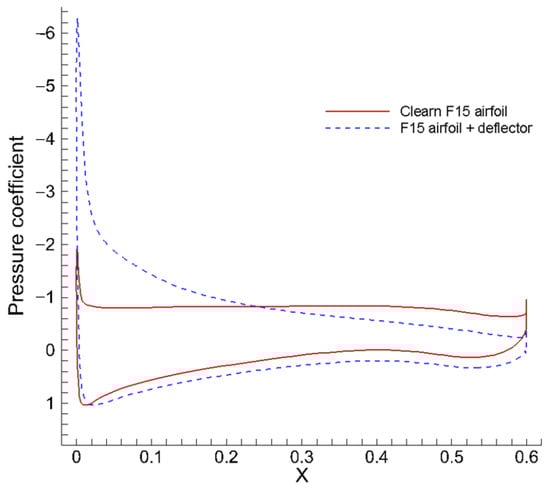 Pressure coefficient comparison for the clean F15 airfoil, the airfoil with the optimal pre-stall deflector, and the airfoil with the reference deflector.