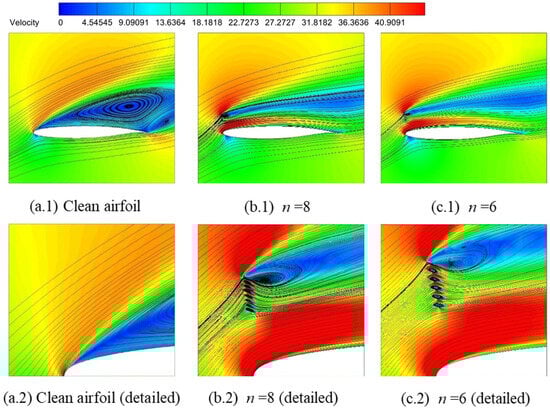 The aerodynamic performance of both the clean airfoil and the airfoil equipped with optimal deflectors was evaluated. Pressure coefficient and lift curve comparisons relative to the clean airfoil are presented in Figure 13 and Figure 14, respectively. Corresponding numerical results are compared in Table 8. All aerodynamic coefficients listed in Table 8 exclude contributions from the flow deflector itself. Compared to the clean airfoil, the optimized deflector configuration exhibits the following: the lift coefficient of the airfoil with the optimal flow deflector increased by 35.28%; the drag coefficient decreased by 15.65%; and the lift–drag ratio increased by 60.39%. These results marginally surpassed the fixed n = 6 configuration. Flow field characteristics are further illustrated through streamline comparisons in Figure 15.