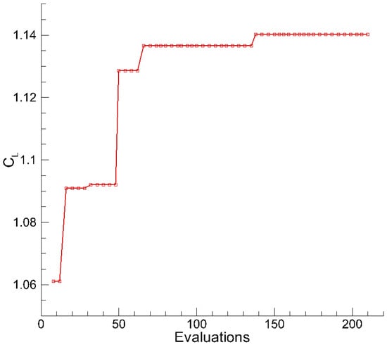 The optimized flow deflector parameters are presented in Table 2. The design parameter attains its lower bound when the and angles exhibit relatively large values. The vane thickness t reaches its upper bound, as illustrated in Figure 4 and Table 3. Compared to the clean airfoil, the optimized deflector configuration increases the lift coefficient by 58.37%, reduces the drag coefficient by 13.59%, and improves the lift-to-drag ratio by 83.29%, as summarized in Table 3.