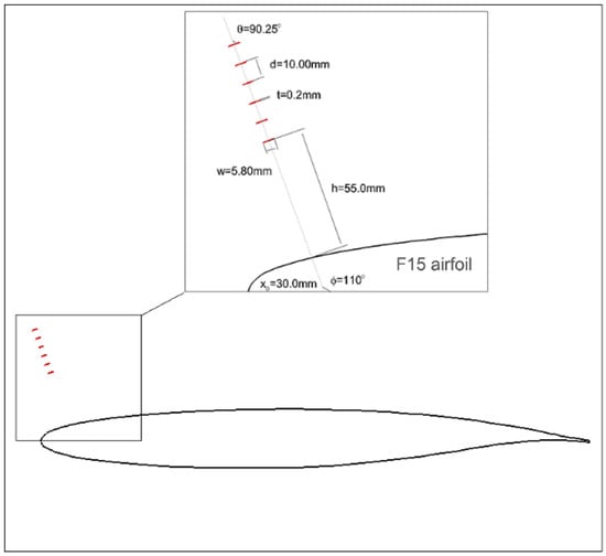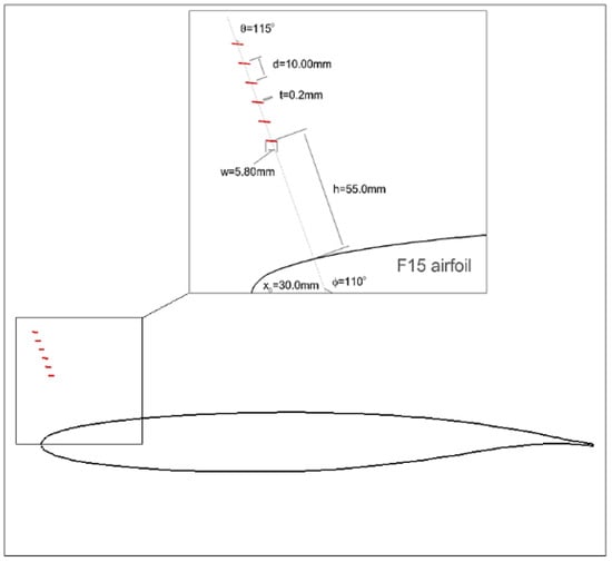 Controlling stall characteristics [,,,] represents a critical challenge in modern aeronautical engineering. When the angle of attack (AoA) increases beyond a critical threshold, airflow over the upper wing’s surface experiences velocity reduction due to viscous effects while simultaneously encountering escalating adverse pressure gradients. Flow control technology [] represents an innovative area of research with far-reaching practical implications across hydraulics, aerodynamics, modern turbine design, and wind power generation. In aerodynamic applications, this methodology [] exerts profound influences across multiple aspects: aircraft lift-to-drag ratio enhancement, wing maneuverability improvement, noise emission reduction, and structural vibration mitigation. The core mechanism centers on strategically manipulating critical flow parameters—including velocity, pressure, temperature, and density—to actively or passively perturb flow fields, thereby optimizing fluid performance or reducing hydrodynamic resistance. Categorized by control-loop architecture and energy input requirements, L.D. Kral [] classified flow control methodologies into two fundamental paradigms: active control and passive control.