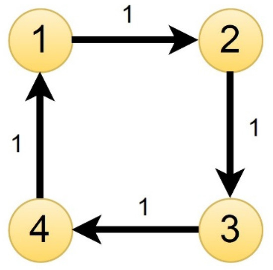 Consider N = 4 agents sharing states via the four-node directed ring graph with unity edge weights of Figure 1, for which the Laplacian matrix is