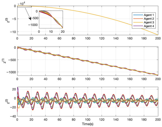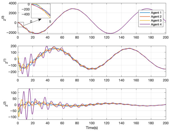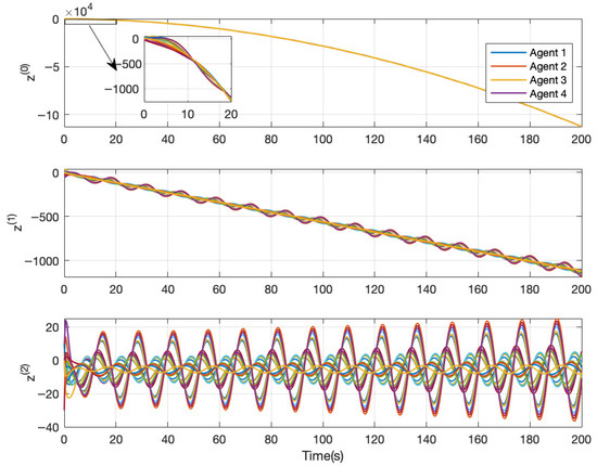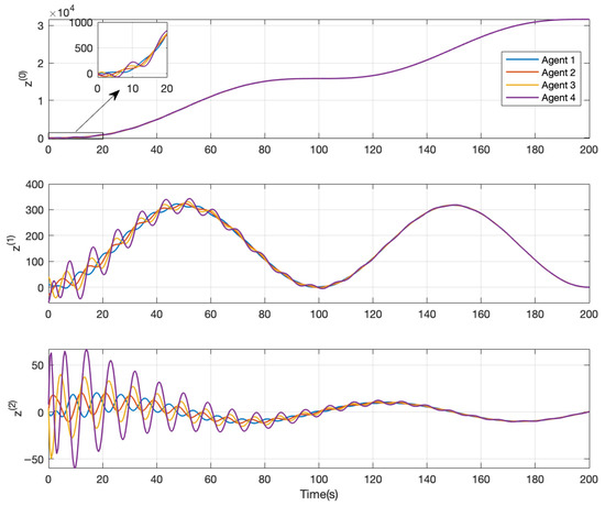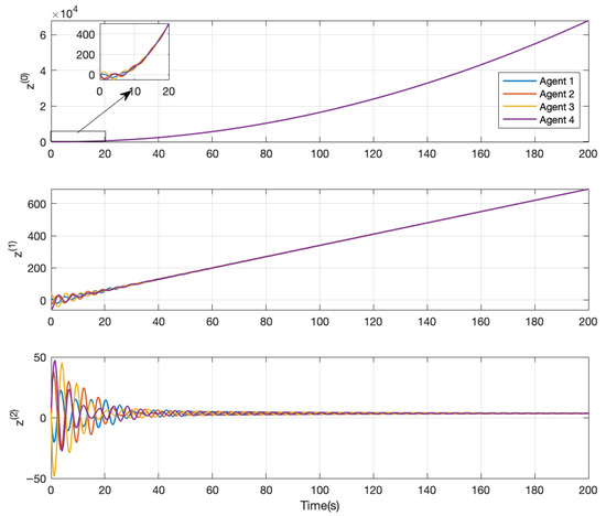 Consensus simulation for Equations (1) (n = 3) and (28) on the network in Figure 5, with , , , and .