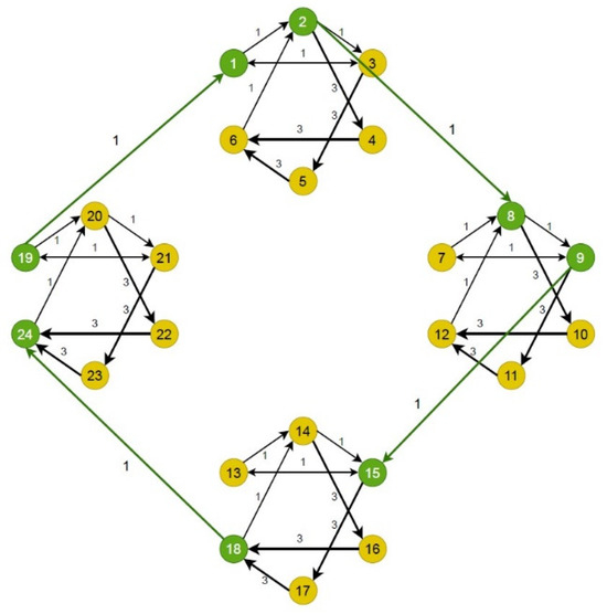 Consider N = 24 agents sharing states via the directed ring graph of Figure 5, where the green nodes in each subgraph transmit/receive information to/from other subgraphs and the Laplacian has the eigenvalue spectrum