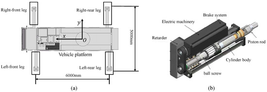 The three-dimensional model of the truck crane platform is shown in Figure 1a, which consists of vehicle body and outriggers symmetrically arranged at four corners. It can be seen that a rectangular support surface with transverse span of 5000 mm and longitudinal span of 6000 mm is formed based on four outriggers. The leveling and lifting functions of the platform are realized through the electric cylinder integrated in each outrigger.