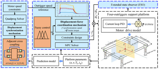 Following the collaborative model construction in Section 2, a SLCM-VLC control strategy based on the MPC frame is proposed. This strategy incorporates a multi-step prediction and rolling optimization mechanism, aiming to enhance dynamic response performance and anti-interference capabilities. In the design phase, the inclination angle of the vehicle platform, the synchronization error among outriggers, the load variation of the outriggers, and the dynamic performance of the electric cylinder are considered as the core indicators and input parameters to co-optimize outrigger position–force performance. The overall structure is shown in Figure 3.