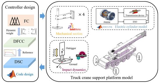 The structure of the rest of this paper is as follows. Section 2 models the four-outrigger support platform and leveling mechanism of the crane. In Section 3, the SLCM-VLC method is proposed, and then the DSC, DFCC, and ESO are designed in turn. Section 4 conducts a multi-domain joint simulation and results analysis. Section 5 summarizes the work of this paper.