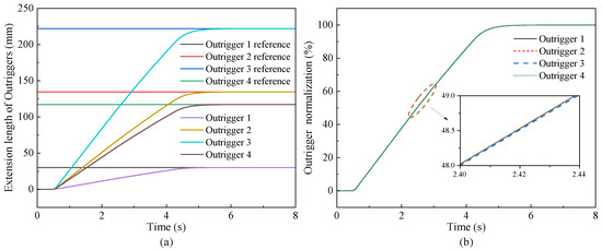 Figure 7 demonstrates the trajectory tracking and synchronous performance of each outrigger under the proposed SLCM-VLC method. It can be seen that all outriggers can extend ideal displacement synchronously within 6 s without overshoot.