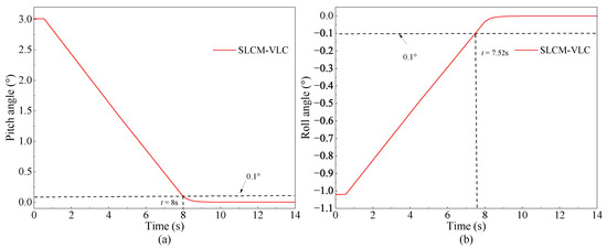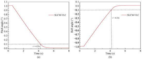 The pitch angle and the roll angle of the vehicle platform during leveling process are shown in Figure 8. It can be seen from Figure 8a,b that both the pitch angle and roll angle can reach a safe range of 0.1° within 4.23 s based on the proposed SLCM-VLC and then further converge the angle to around 0° finally. These indicate that the proposed SLCM-VLC can achieve high-precision synchronous leveling with a fast speed.