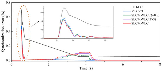According to the initial inclination angle, it can be found that the outrigger 3 is the lowest point and the outrigger 1 is the highest point. The greater inclination results in a more significant difference in the load distribution among the outriggers. Figure 14 and Figure 15 are the relative synchronization error and load variation in each outrigger under this condition. Within the period from 0 s to 1 s, it can be seen that sudden increase in synchronization errors and the load of the outriggers are caused by the huge impact at the start of the leveling. At the same time, it can be seen that the synchronization errors of the five controllers are close at 0.25%, but the PID-CC controller is more sensitive to the huge impact, resulting in a relatively lagging convergence speed compared to the other five controllers. When the other controllers achieve completed error convergence within 0.8 s, the PID-CC is still at an error state of 0.1% with a slow convergence speed. It leads to the maximum initial load of the PID-CC being different among the four outriggers before leveling, with the maximum load difference reaching 17 kN (outrigger 1 and outrigger 2), which is much higher than the other four controllers.