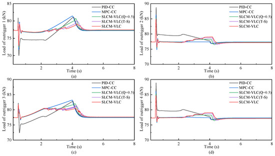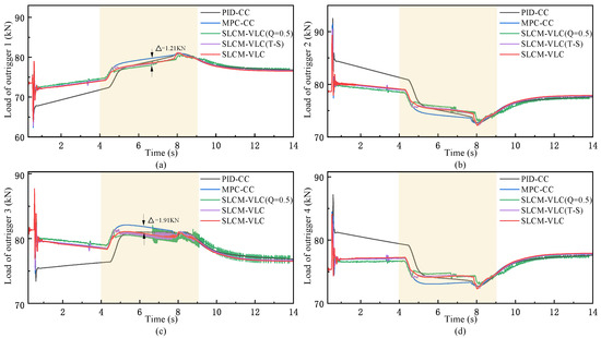 As shown in the relative synchronization error in Figure 9, during the startup stage of the synchronous leveling from 0 s to 1 s, there is a sudden change in the synchronization error of four outriggers under PID-CC, with the peak error reaching as high as 0.70% and a convergence lag of nearly 1 s. In contrast, the other four methods suppress the peak of the relative synchronization error to approximately 0.40% and rapidly converged the error to around 0 within 0.3 s, which can be attributed to the unique rolling optimization capability of the MPC framework. As leveling progresses, the proposed SLCM-VLC and SLCM-VLC(T-S) exhibit the most significant fluctuations between 2 s and 5 s and then rapidly converge to zero. This abnormal state is caused by the change of the synchronization matrix attributing to the displacement–force coordination mechanism of the DFCC as a result of balancing the synchronization error and the load on outriggers, which will be further analyzed in subsequent Figure 10.