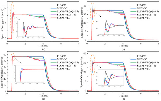 The speed diagram of the four outriggers is presented in Figure 11. From 0.5 s to 0.7 s, smaller overshoot and faster initial convergence speed are exhibited with the control of SLCM-VLC compared with the traditional control method (MPC-CC, PID-CC), exhibiting excellent dynamic response performance. Moreover, it can be seen that the output of speed responds to the changes under force constraint after 2 s, owing to the load constraint designed in the SLCM-VLC. Notedly, unlike the T-S fuzzy control that relies on the exact model, the proposed method performs better in response speed compared to the SLCM-VLC(T-S); this advantage stems from the lower computational complexity and efficient reasoning mechanism of the in-built fuzzy controller, which can quickly adapt to dynamic changes. Table 5 displays the detail speed data during the start-up phase from 0 to 2 s, corresponding to Figure 11.