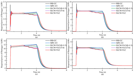 Figure 12 illustrates the power variation during the operation of each outrigger. At the beginning of start-up, substantial power is required by each controller to counteract the gravitational potential energy imposed by the crane on the outrigger. Notably, high instantaneous power is exhibited by the PID-CC, which may affect the safety of the controller. During the leveling process, the proposed SLCM-VCL (including fixed weight and T-S type) consistently consumes less power than the MPC-CC. After 2 s, the proposed SLCM-VCL shows a clear reduction in required power and no oscillation compared with fixed-weight and T-S types. These observations align with the results in Figure 10 and Figure 11, indicating that the position–force mechanism in the DFCC is activated, and the change in the weight Q generated by the fuzzy controller is stable. These results show that the proposed SLCM-VCL not only ensures position–force coordination but also produces lower and stable power requirements.