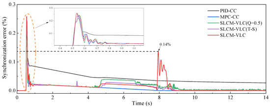 Comparison of relative synchronization error on the flat road.