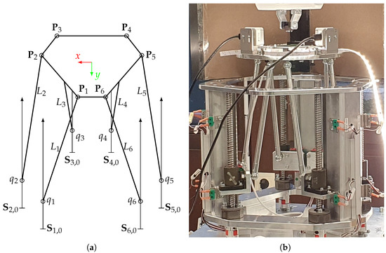 Studied Hexaglide configuration. (a) Hexaglide kinematic scheme. (b) Hexaglide prototype with ball screws as joint axis actuators. Ball joints are used on both ends of bars.