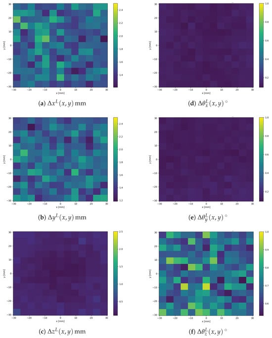 The same observations regarding the relative magnitudes of horizontal and vertical EEF pose deviations can be made for the combined manufacturing error case as for separate error sources: manufacturing error transmission is much stronger in the x, y, and directions than in the other three EEF movement directions. Further, no circular symmetry of the combined deviation field is observed as the deviation induced by axis orientation errors is much smaller than those caused by the other error sources.