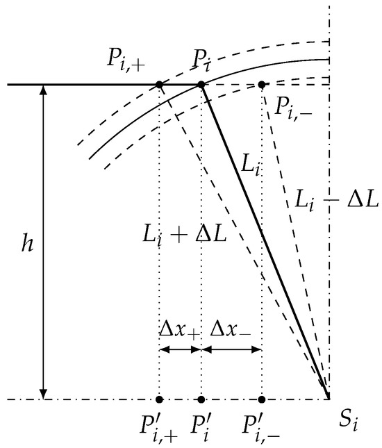 Assuming that the other five Hexaglide bars have ideal fixed length L, adding a small inaccuracy, , exclusively to the examined bar length, , only leads to a negligible increase in the elevation of the platform, . We define two new platform connection points, and , for shorter-than-ideal or longer-than-ideal bars. Now, the horizontal EEF deviation magnitudes, , can be determined knowing the bar length error, mm, and the specification bar length, mm: