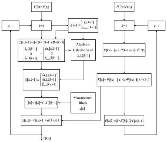 The principles for the development of the Kalman filter outlined above are graphically illustrated in the block diagram in Figure 2. The structure was developed in two parallel circuits––one for estimation of the states, , the other for the dynamic computation of the covariance matrices, and , and the Kalman gain, , which determine the forecast error covariance, the updated estimate covariance, and the weighting factor for the state correction, respectively. The calculation of these quantities was based on the dynamic and measurement patterns shown in the algorithm. The first circuit covered the prediction of states, the algebraic determination of angular acceleration, and the updating of estimates using innovation. In this part of the scheme, the load was considered as a dynamic variable identified by empirical modeling based on experimental data and numerical analysis, as detailed in Section 3.2. The second circuit calculated and updated the covariance matrices and the coefficient based on the dynamic and measurement models presented in the algorithm, thus taking into account the influence of nonlinearities and noises in each iteration. This chain includes an adaptive mechanism for updating the covariance matrix of errors in the model, as discussed in detail in Section 4, and a hybrid algorithm for determining the correlation matrix of measurement errors, as described in Section 5.