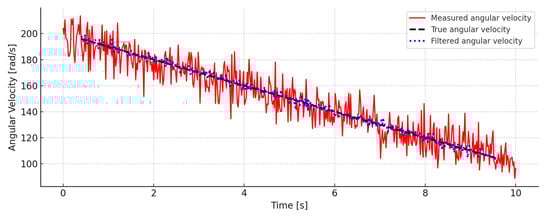 As shown in Equation (12), the dynamics of the external load, , are described by an approximate differential model that takes into account both external influences and internal dissipation mechanisms in the system. In order for this dependence to be integrated into the structure of the Kalman filter, it was necessary to quantify , , and based on experimental data. The methodology used to numerically determine the coefficients and and the pressure correction factor, , involved regression analysis, based on experimental data on the control inputs and measured quantities. To limit the effect of measurement noise and increase the robustness of the regression model, the measured values of angular velocity and pressure difference were smoothed using the Savitzky–Golay filter [29]. This provides more reliable input data for the identification of external load dynamics.