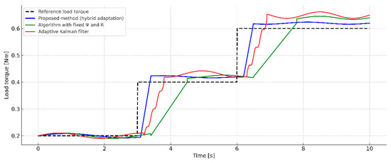 In order to validate the characteristics of the proposed method in conditions close to real operating modes with smoothly changing dynamics, Figure 18 presents the results of the operation of the three considered algorithms under reference influence of an asymmetrically varying sawtooth load (black dashed line). The blue line depicts the reaction of the proposed method, the red line depicts the reaction of an adaptive Kalman filter with varying parameters, and the green line depicts the reaction of a filter with fixed values of the covariance matrices.
