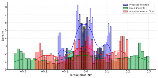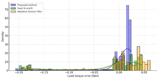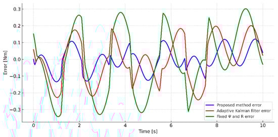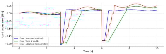 A clearer picture of the accuracy of each of the methods considered can be obtained by analyzing the load torque recovery errors presented in Figure 19. The graph illustrates the deviations between the estimated and reference values over the entire exposure interval. The results show that in the proposed method, the errors remain within narrow limits, with a symmetrical distribution around the zero line, which indicates good compensation of the dynamic components and the absence of systematic bias. With the adaptive Kalman filter, the deviations are more noticeable, especially in areas with a sharp change in load, while with the fixed-die filter, significant systematic errors and a wider range of fluctuations are observed.