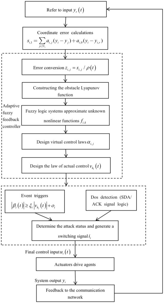To ensure the clarity and systematic nature of the control strategy, the overall framework of the proposed adaptive event-triggered full-state constrained controller is first presented in Figure 1. This framework integrates core modules such as DoS attack detection, an event-triggering mechanism, adaptive fuzzy control, and state constraint handling, forming a synergistic and organic whole.