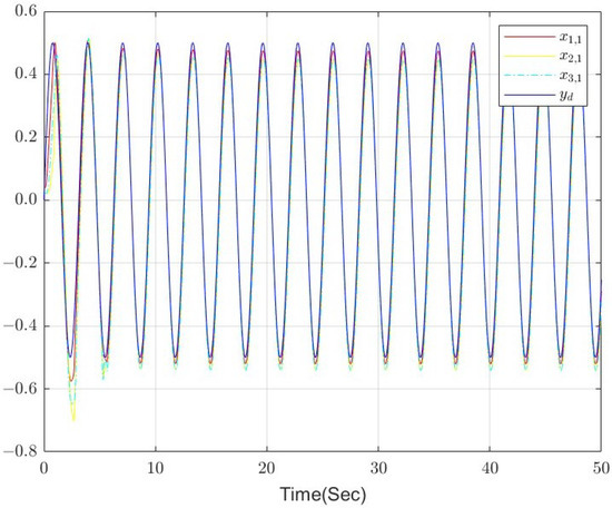 Finally, to verify the effectiveness of the proposed method in the multi-agent system, this paper applies the Lyapunov stability theorem. Through theoretical derivation and analysis, it is proven that the outputs of all followers in the system can be consistent with the output of the leader. Meanwhile, the tracking error is successfully confined within a relatively small neighborhood. This conclusion has also been verified via MATLAB simulation. This result fully demonstrates that the designed control method has high-performance and high-precision characteristics in practical applications, can meet the strict requirements of practical engineering for system stability and control accuracy, and provides valuable theoretical support and technical reference for engineering practices in related fields.