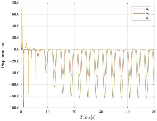 From Equation (32), it is known that the intermediate control signal is differentiable. Since all signals in the function are bounded, the constants and hold. For and , can be obtained; therefore, the Zeno phenomenon is successfully avoided. The minimum inter-event time is explicitly lower-bounded by , where ℓ is the triggering threshold and is the upper bound of . In our simulation, s, which ensures practical implementability.