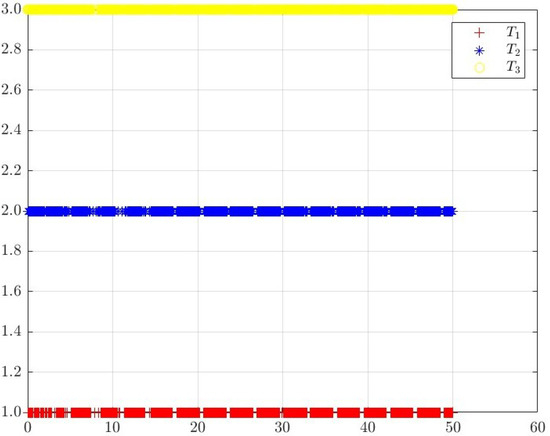 Figure 4 shows the scenario where three agents track the trajectory of the leader. Figure 5 displays the tracking errors between the three followers and the leader’s trajectory, respectively, as well as the performance function given in this paper. From Figure 4, Figure 5 and Figure 6, it can be seen that the control strategy designed in this paper is very effective, and the system output error converges to a small neighborhood within a certain period of time. Figure 7 and Figure 8 present the control inputs and the update instants of the controller, respectively. These two figures indicate that the network attack detection mechanism and the event-triggered strategy designed in this paper have achieved good results.