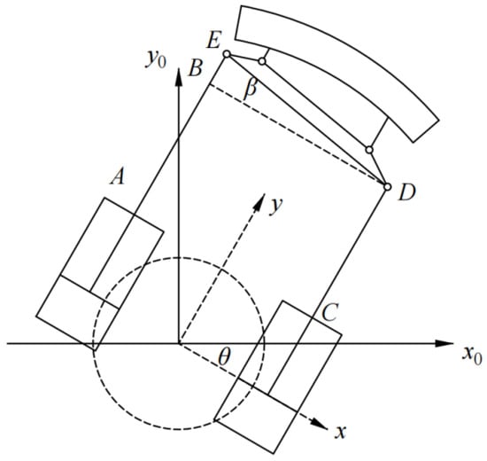 The schematic structure of the dual-cylinder lifting mechanism is illustrated in Figure 2. The installation distance between the two hydraulic cylinders is denoted as L, with their initial extension lengths being equal, . Due to master–slave control errors and segment load imbalance, a displacement error can occur between the synchronized cylinders. The rotation angle of the mechanism, , is defined as the deflection angle of the segment’s center of mass.
