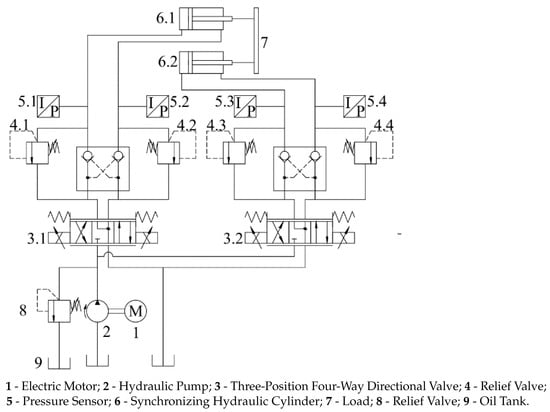 - Zhang, L.; Li, Y. Synchronous control of double hydraulic cylinders of scissors aerial work platform based on fuzzy PID. In Proceedings of the 2020 5th International Conference on Electromechanical Control Technology and Transportation (ICECTT), Nanchang, China, 15–17 May 2020; pp. 349–354. [Google Scholar]