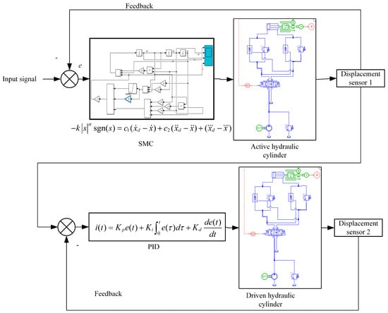 where s defines the sliding mode variable, which represents the deviation from the target trajectory; denotes the desired displacement of the hydraulic cylinder (m); x indicates the actual displacement of the hydraulic cylinder (m); represents the velocity of the hydraulic cylinder (m/s); symbolizes the acceleration of the hydraulic cylinder (m/s2); are the sliding surface coefficients (dimensionless), which determine the dynamic response.