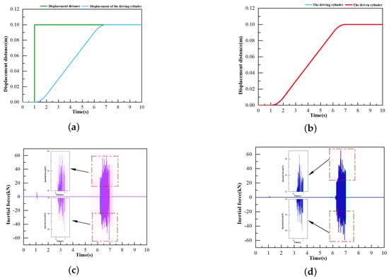 (a) Displacement variation in the driving cylinder; (b) relative displacement between driving and driven cylinders; (c) inertial force variation in the driving cylinder; (d) inertial force variation in the driven cylinder.