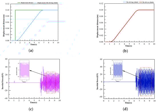 (a) Displacement variation in the driving cylinder; (b) positional variation between driving and driven cylinders; (c) inertial force variation in the driving cylinder; (d) change in inertial force of the driving cylinder.