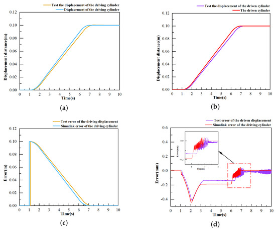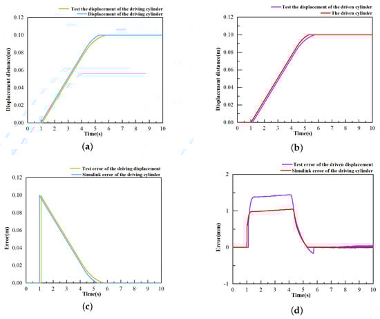 (a) Position variation in the driving cylinder; (b) position variation between driving and driven cylinders; (c) position variation comparison between experimental tests and Simulink simulation; (d) position variation between driving displacement and driven displacement.