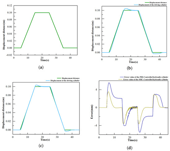 (a) Ramp displacement curve; (b) experimental displacement with PID control; (c) experimental displacement with SMC; (d) hydraulic cylinder error comparison.