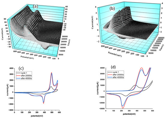 Figure 1a,b illustrate the electrochemical behavior of NF in 2 M KOH during activation over 40,000 s with FFTCCV curves at 0.7 V·s−1 and 0.007 V·s−1, respectively. Analysis of these 3D curves provides detailed information on the current at specific times or potentials where the most significant changes occur. At high sweep rate (0.7 V·s−1), the CV shape was largely preserved after prolonged cycling, indicating structural robustness of the activated film. At a slow sweep rate (0.007 V·s−1), however, progressive changes in the voltammograms revealed significant surface restructuring. This demonstrates that FFTCCV not only enables activation but also provides a means of tailoring sweep rate to engineer electrode stability—balancing fast responsiveness with long-term durability for actuator performance.