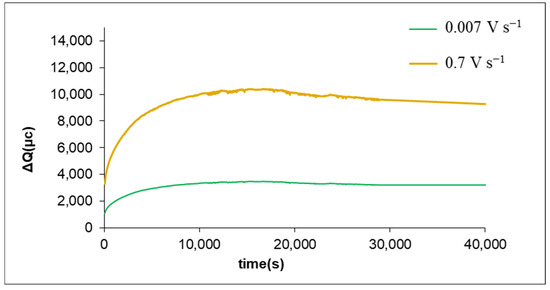 Calculated charge difference in cathodic range of FFT cycle voltammograms for NF in KOH (2M) for 40,000 s, separately as a function of time at different sweep rate (0.007, 1.4 V s−1).