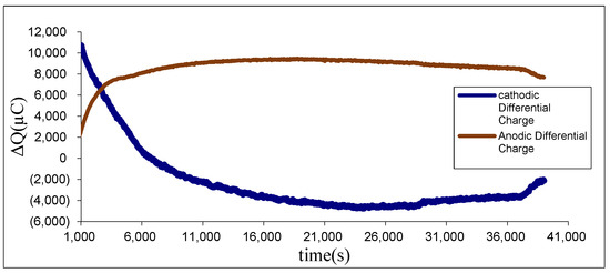Beyond total charge monitoring, FFTCCV enables independent evaluation of anodic and cathodic contributions (Figure 3), offering a deeper perspective on electrode-specific dynamics. Ideally, anodic and cathodic ΔQ should be balanced, reflecting symmetric charge storage and release. In practice, however, clear discrepancies emerge due to kinetic asymmetry, irreversible phase transitions, electrolyte decomposition, or progressive loss of electroactive material. As shown in Figure 3, the anodic ΔQ increases rapidly in the early activation cycles, reaching ~9000–10,000 µC before gradually stabilizing. By contrast, the cathodic ΔQ exhibits a sharp maximum at the beginning but declines steadily throughout the 40,000 s activation, eventually becoming negative before showing slight recovery near the end. This distinct divergence provides direct evidence that cathodic processes are the dominant source of degradation, likely due to limited reversibility of reduction reactions, preferential loss of active sites, and structural instabilities in the reduced phase.