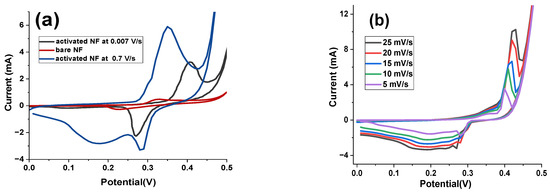 (a) CVs of bare, and activated NFs in KOH 2M at 0.007 and 0.7 V/s with sweep rate of 25 mV/s and (b) CVs of activated NF for 10,000 s at 0.7 V/s at the various scan rates (5–25 mV s−1).