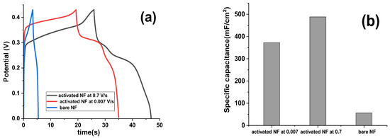 (a) the GCD profiles and (b) calculated SCs at the current density of 10 mA/cm2 of bare NF and activated NF at different sweep rate of 0.007 and 0.7 V/s for 20000 s and 10,000 s, respectively.