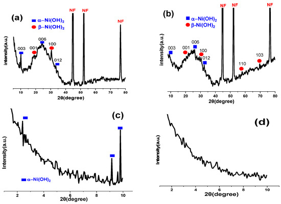 Bulk (wide-angle) XRD patterns (a,b) and low-angle XRD patterns (c,d) of the activated NF after 40,000 s at sweep rates of 0.7 V·s−1 (a,c) and 0.007 V·s−1 (b,d).