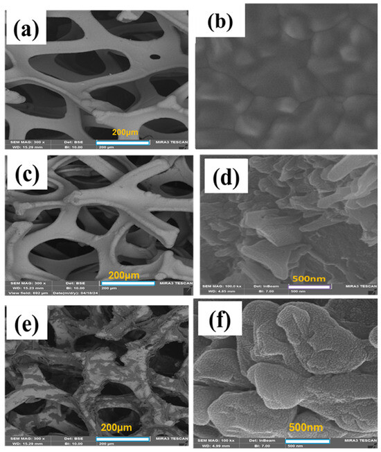 FE-SEM surface images of NF electrodes with unified scale bars: (a,b) pristine bare NF; (c,d) NF activated at 0.007 V·s−1; (e,f) NF activated at 0.7 V·s−1.
