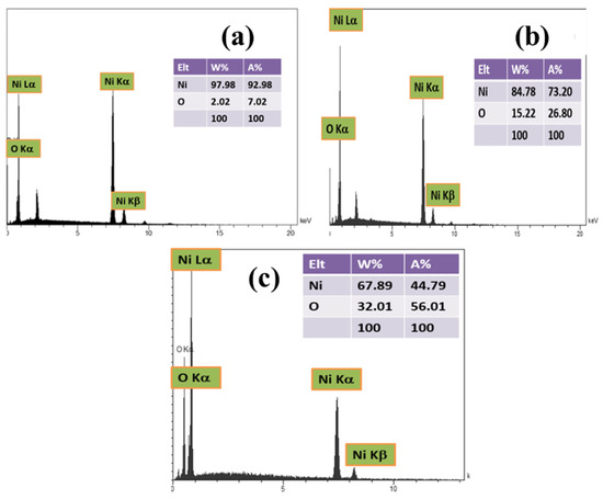 EDS spectra of NF electrodes: (a) pristine bare NF, (b) NF activated at 0.007 V·s−1 and (c) NF activated at 0.7 V·s−1.