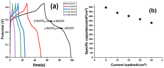 The GCD profiles of NF electrodes, activated via FFTCCV for 10,000 s in 2 M KOH at a scan rate of 0.7 V/s, were evaluated at current densities ranging from 5 to 25 mA/cm2 (Figure 9). The dominance of the α-Ni (OH)2 phase under these activation conditions is evident from the pronounced GCD plateau at lower potentials, indicative of enhanced pseudocapacitive behavior. SC of 546.5, 488.37, 453.48, 418.60, and 378.53 mF/cm2 were recorded at 5, 10, 15, 20, and 25 mA/cm2, respectively. These values significantly outperform previously reported capacitances for similar systems (e.g., 15 mF/cm2 [46]), highlighting the superior electrochemical performance of the α-phase, particularly at lower current densities where efficient ion diffusion and surface utilization maximize electroactive site availability.